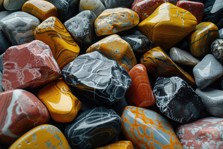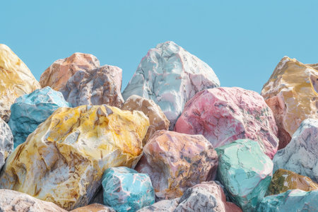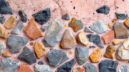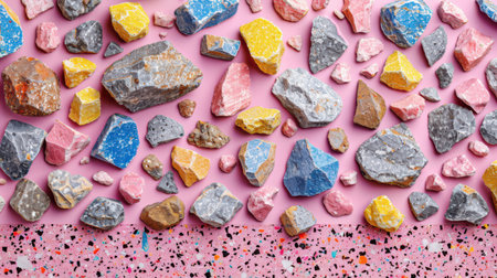 Dynamic abstract composition of multicolored minerals and cobblestones colliding in space