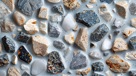 A collection of various stones of different shapes, sizes, and colors is arranged neatly, showcasing natural textures and unique patterns. Each stone reveals its distinct beauty.
