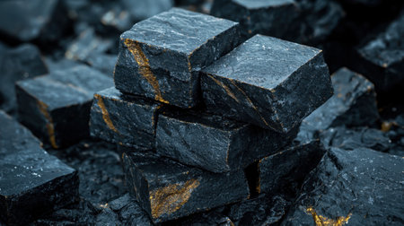 Various blocks of dark mineral are arranged in a stacked formation, showcasing unique textures and glints under a cool light.