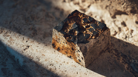 Exploring the intricate texture and metallic sheen of a meteorite on a rocky surface