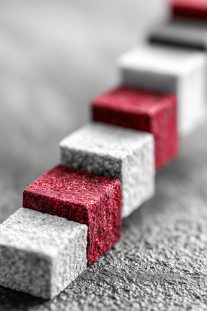 A close-up of red and white cubes with a textured surface, set against a blurred background, highlighting their geometric shapes.