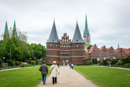 Lubeck, Germany - May 31, 2015: People are spending time near the Holsten gate of Lubeck in Germany
