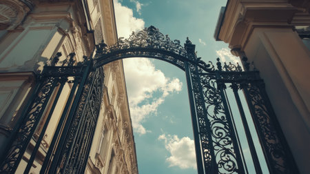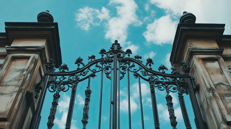 iron gates, with intricate scrollwork and filigree, leading to stately mansion, created with generative ai