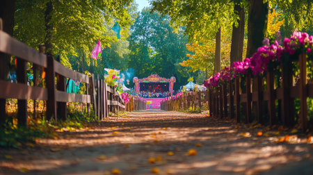 A vibrant and colorful pathway adorned with flowers leads to a festive celebration in a park, surrounded by lush greenery and trees. The scene captures joy and community spirit.