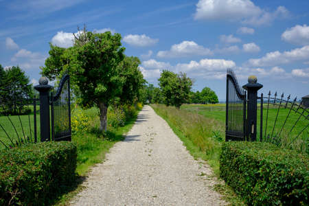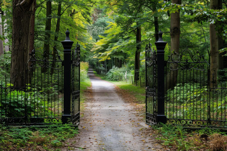 Inviting gravel path is leading into a peaceful forest through an open wrought iron gate
