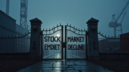 That the image is generated using AI. Industrial gates at night with stock market embed decline signage.