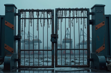 That the image is generated using AI. Locked iron gate with chains and trade war sign at industrial port in foggy evening.