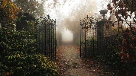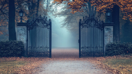 A captivating scene of open iron gates framed by vibrant autumn leaves, set against a foggy backdrop in a tranquil forest. Perfect for evoking mystery.