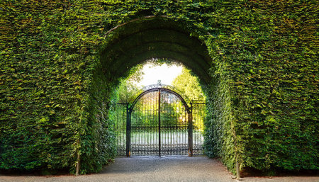 This captivating image showcases a scenic pathway framed by lush green trees, with an inviting open gate welcoming visitors to explore the tranquil park setting.