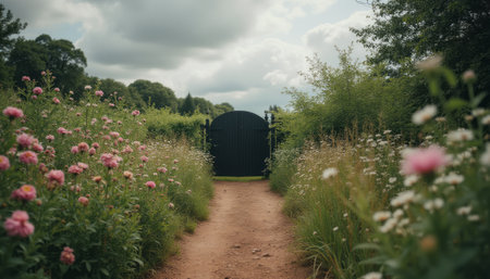 A serene pathway meanders through vibrant pink flowers and lush greenery, leading to a striking black gate. This picturesque scene evokes a sense of wonder and tranquility, inviting viewers to explore the hidden beauty beyond the gate.