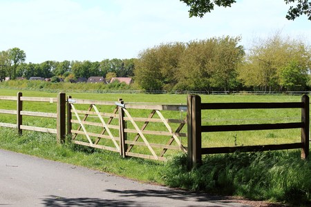 Scenic view of a white wooden gate leading to a lush green meadow under a beautiful cloudy sky, creating a peaceful rural landscape
