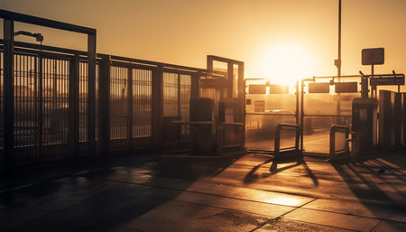A Shot of a Black Gate at the Entrace of a Gated Community with a Bright Orange Sunset in the Background