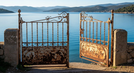 That the image is generated using AI. Rusty iron gates of abandoned industrial complex at dawn with fog and cranes.