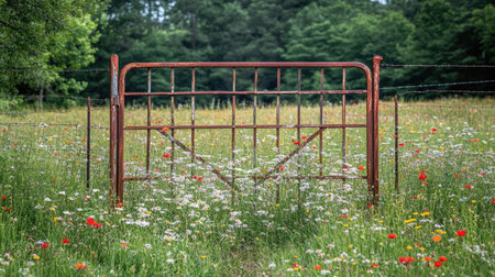 A rustic metal gate stands amidst a stunning display of wildflowers in a lush green field, embodying the charm of rural landscapes and nature's vibrancy.