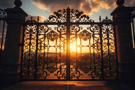 An ornate wrought iron gate with intricate details glows warmly in golden sunlight, surrounded by lush trees and serene pathway