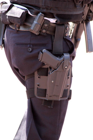 Bucharest, Romania - July 29, 2020: Details with a brand new Beretta PX4 gun in the holster of a Romanian female police officer during an event of the Police Force.