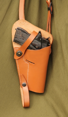 A Vintage Pistol Hand Gun Hanging in a Leather Holster