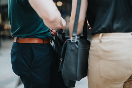 Young Asia woman putting a gun in her handbag, Women hand pulling a pistol out of the bag on the park