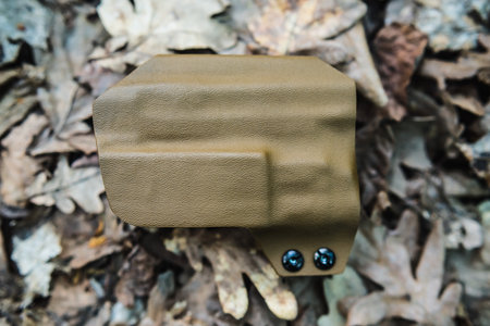 Pistol in the holster. The shooter trains. Is preparing to shoot at the target