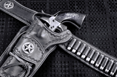 Old cowboy 45 pistol and leather tooled holster in black and white..