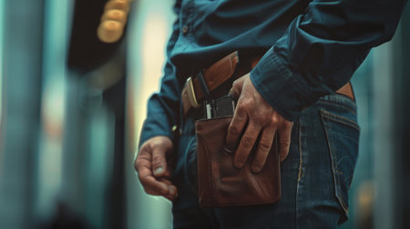 Robber pulls out a gun tucked in his blue jean. criminal and robbery concept.