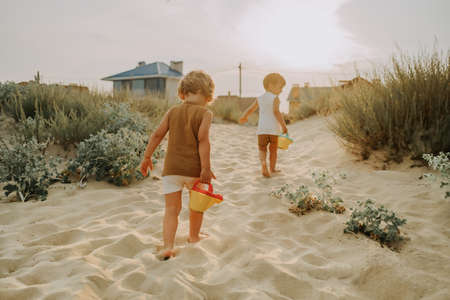 Cute little boys watering plants with cans on sandy beach. summer sunny day. Toddlers twins with colorful pots. Natural aestetic portrait of children.