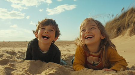 Two joyful children laugh and play on a sandy beach, capturing the essence of innocence and happiness under a bright blue sky, creating lasting memories.