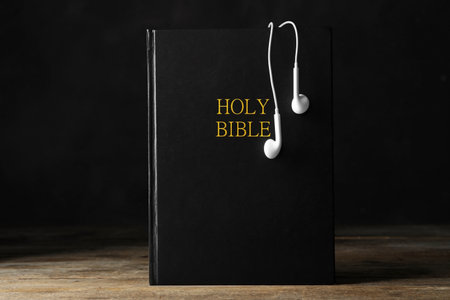 Bible and earphones on wooden table. religious audiobook