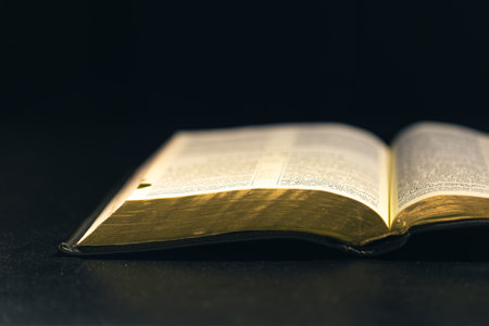 Open Bible on a black background. Religion concept.