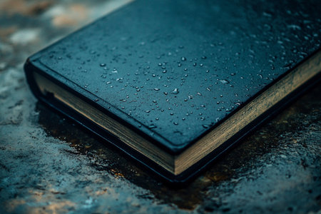Black book with water drops on it. Selective focus. Toned.