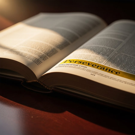 A selective focus shot of an open bible on a wooden surface with a blurred background