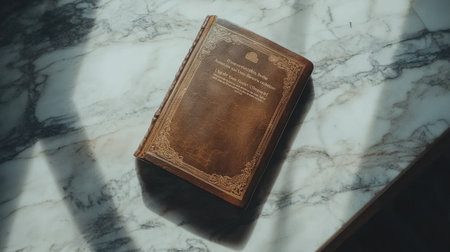 A leather-bound Bible with gold-edged pages, lying on a marble countertop under soft light.