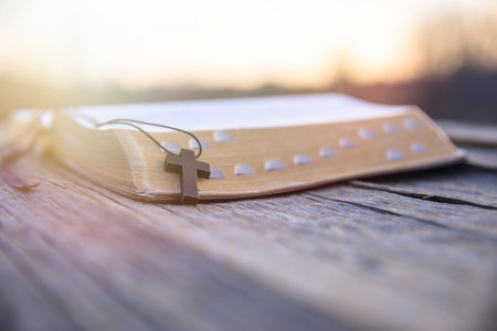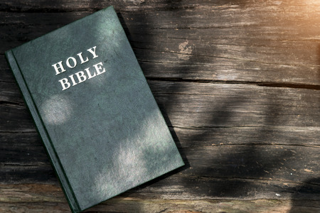 Holy Bible on a wooden table with morning sun for devotion to Christians