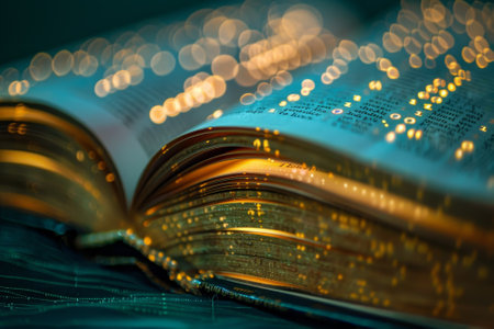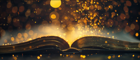 An open book glowing with magical golden light, surrounded by bokeh, symbolizing imagination, knowledge, and storytelling