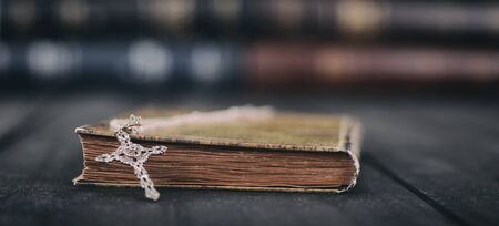Old ancient antique catholic bible on wooden background with copy space.