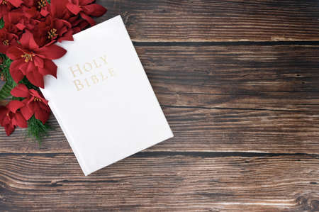 Church on Christmas with white bible and red poinsettia flowers on holiday background. Christian concept