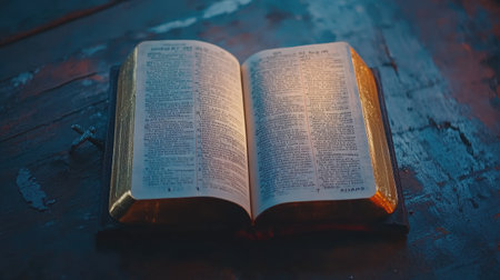 Open Holy Bible on table, with shadow on page. Copy space.