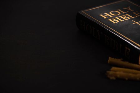 selective focus of holy bible and candles on black dark background