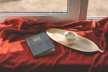 Bible on a background of home interior. The concept of faith, spirituality and religion. Peace, hope, dream concept