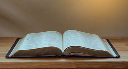 Open Holy Bible on a brown wooden table.Open Holy Bible top view.Religious concept.
