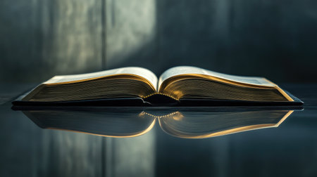 Open book bathed in a dramatic light beam, with shadows around creating a moody, dark background