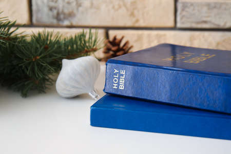 Holy Bible with decorations on table in room. christmas story