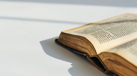 One open thick book on white table in the dark.