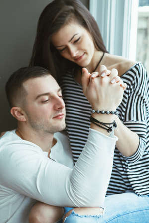Moments of tenderness and love of romantic couple during their honeymoon. Recreation and tourism. Romantic relationships .. Rest at hotel. Honeymoon. Wonderful moments of life. Lifestyle.