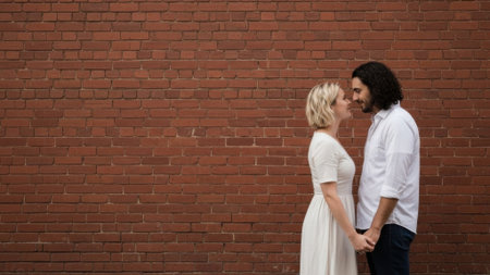 A romantic moment between a couple standing close together, holding hands and looking into each others eyes against a textured brick wall.