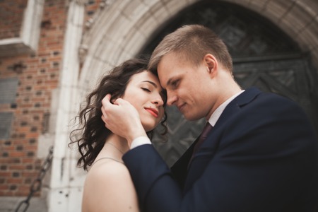 Gorgeous wedding couple, bride, groom posing near old gate building.