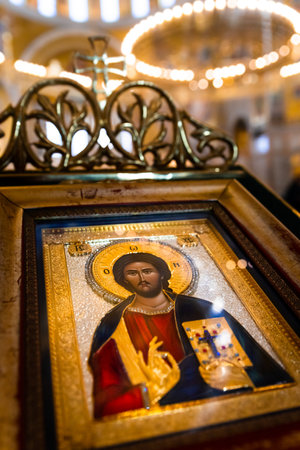 Belgrade, Serbia - December 20, 2022: Icon of Jesus Christ in Byzantine style orthodox temple named Saint Sava in Belgrade, Serbia