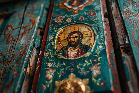 Closeup view of an ancient religious icon painted on a weathered wooden door