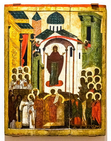 Veliky Novgorod, Russia - August 17, 2017: Antique Russian orthodox icon. The Protection of the Virgin, 16th century