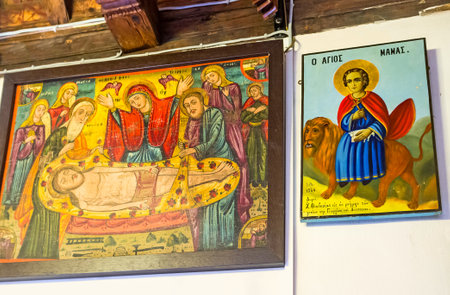 Omodos, Cyprus. May 2018. A religious icon from 1866 on display in the monastery of the Holy Cross in Omodos in Cyprus.